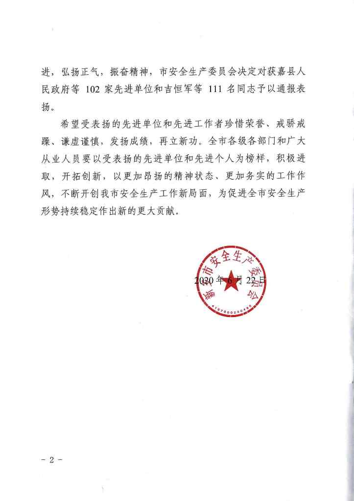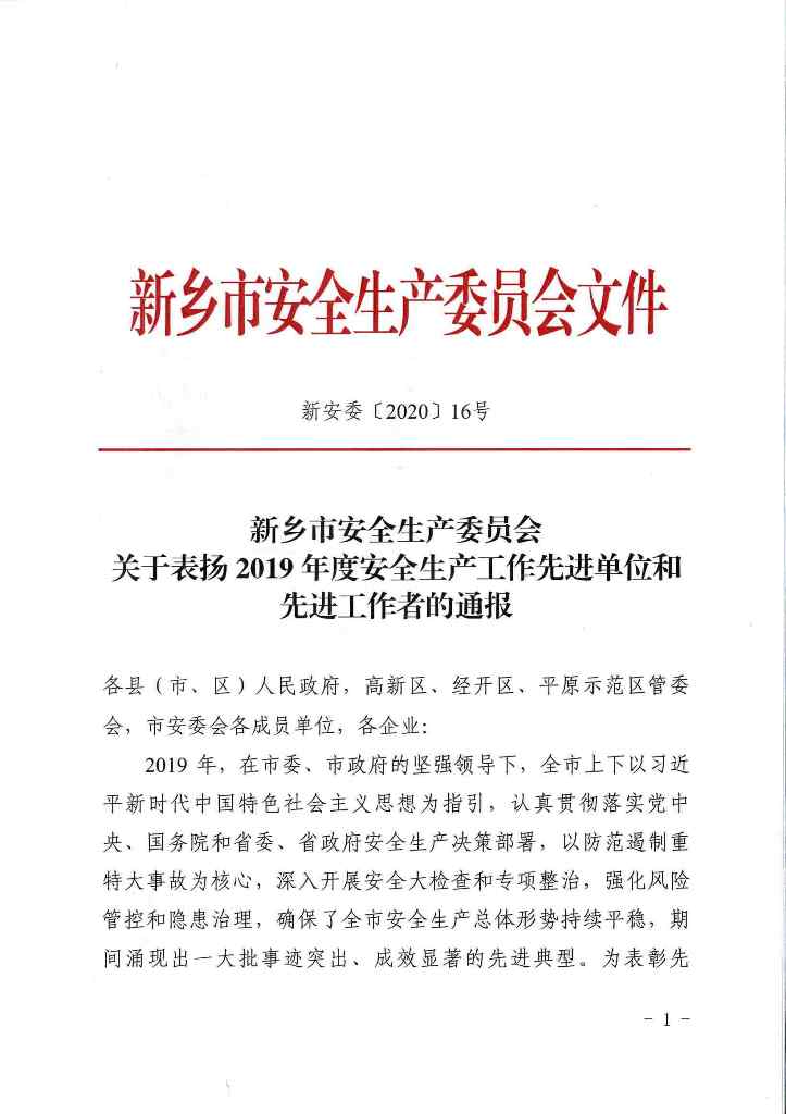 (发布时间:2020-07-20 点击:4269)日前,从新乡市安全生产委员会传来消息,我公司被新乡市安全生产委员会评为“2019年度安全生产工作先进单位”。这一荣誉称号的获得,是对我公司安全生产工作的高度认同和表扬。