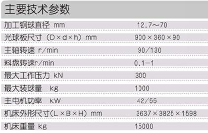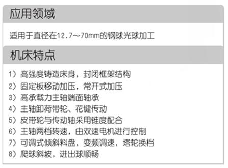 (1) 本机床采用卧式布局和循环加工方式。主机为了强化整体刚性,采用整体封闭框架式铸造结构,刚性好,精度高且保持性好。输球料盘采用倾斜式料盘,变频无级调速。料盘与尾架接盘使用可调式铰链联接,调整方便。油缸采用液压驱动加压,蓄能器保压机构,保压稳定可靠。主轴转速由双速电机进行控制。机床尾架导向杆采用由微型油泵组成的润滑系统,安全可靠。