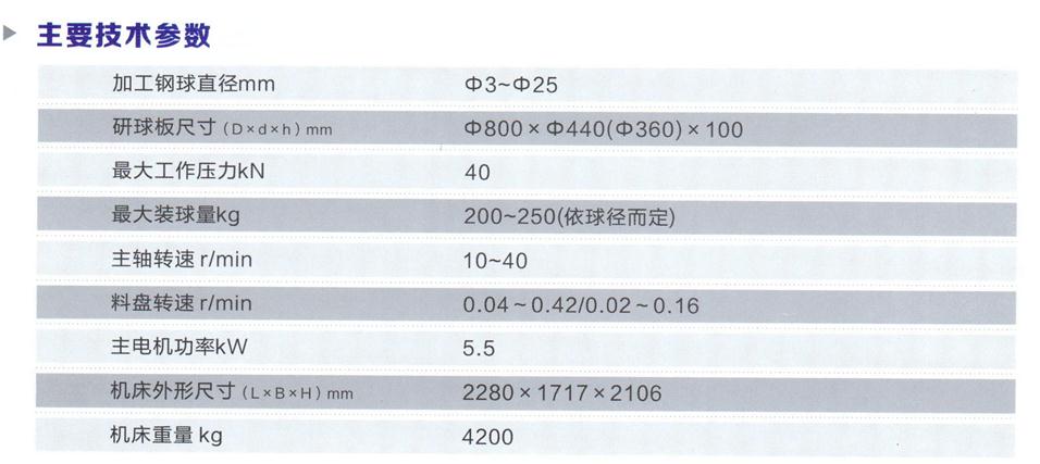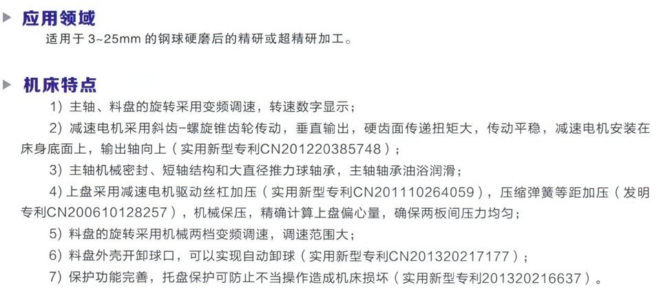 本机床是轴承厂和专业钢球制造厂加工钢球用的专用机床,适用于3~25mm的钢球硬磨后的精研或超精研加工。(对于直径3 mm ~5 mm的钢球还可以进行硬研加工以代替硬磨工序。)经本机床加工后的钢球精度可达G10~G5级。