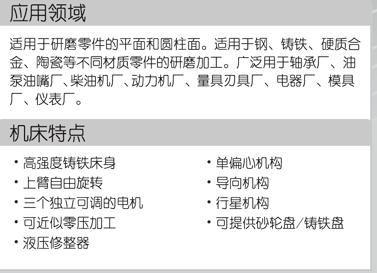 机床备有液压修整器、单偏心机构、导向机构和行星机构。根据特殊订货要求可供应砂轮盘。
