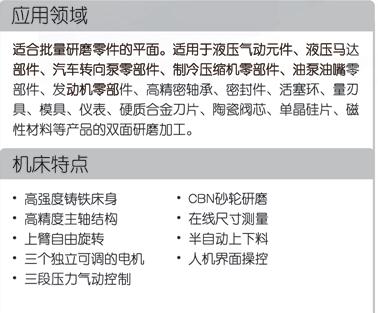 本机床为自动、高效率机床,适用于批量研磨零件。主要用于研磨零件的平面,适用于钢、铸铁、铜、硬质合金、陶瓷、单晶硅等的加工。可以广泛用于液压气动元件、液压马达部件、汽车燃油泵部件、制冷压缩机零部件、油泵油嘴零部件、发动机零部件、高精密轴承滚柱及套圈、密封件、活塞环、量刃具、模具、仪表、硬质合金刀片、陶瓷阀芯、磁性材料等产品的双面研磨加工。