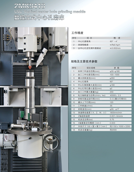 本机床主要对轴类零件两端的中心孔进行磨削加工,特别是大中心孔轴类零件(如机床主轴),保证两端中心孔的同轴度,提供中心孔的精度。